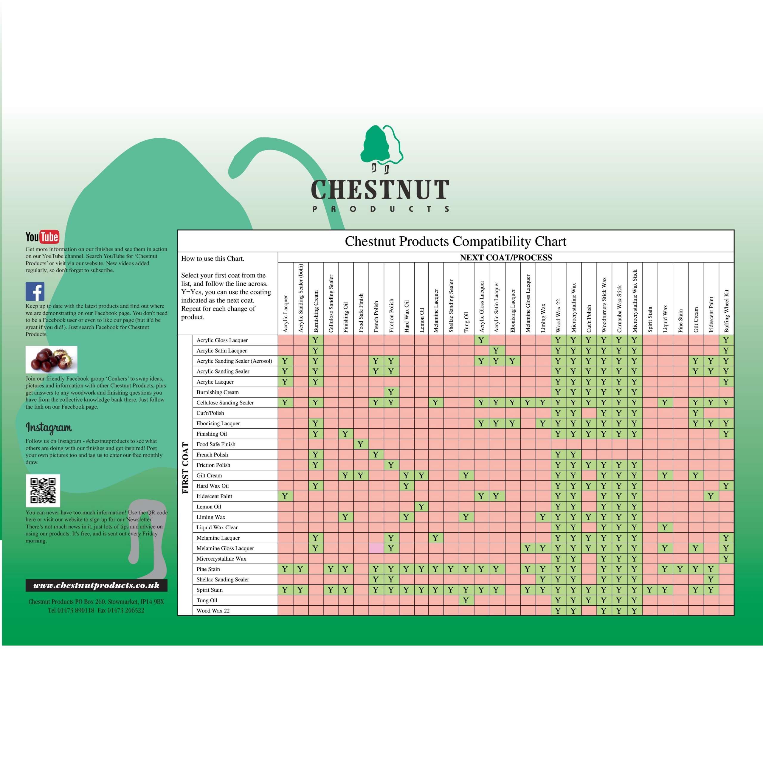 It will look great on any workshop wall and serves as the ultimate guide to what each of our products can – and importantly can’t – be followed with. Never again have to worry about which sealer with which lacquerGenerally speaking, lacquers are hard wearing and quick drying, designed to give a tough, long lasting finish to any piece of timber they are applied to. We have two types of lacquer, water based and cellulose based, each with slightly different properties and characteristics. Our Melamine Lacquer i... More, what you can put under an oil, it’s all here.