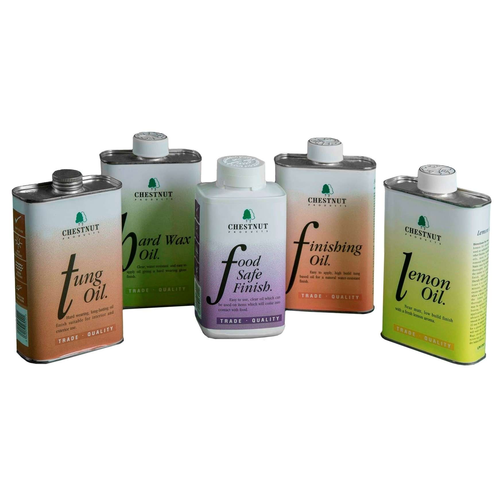 A set of quick drying, fade resistant stains in a range of wood colours.